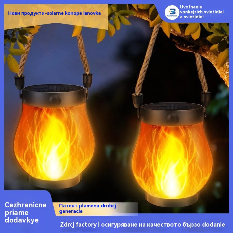 Соларна лампа с пламък, фенер от конопено въже, декорация за градински двор